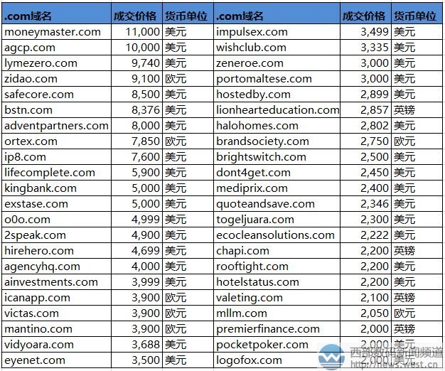 Sedo交易榜:意大利域名夺得冠军!“比特币”域名bitcoins.co拍出五位数!西部数码(west.cn)7月6日消息,最新一期的sedo交易榜出炉,本期上榜的域名共有61个,其中卖价最贵的是意大利国别域名flix.it,成交价为22,000美元,约合人民币15万元。 .com域名方面,本期表现平平,五位数美元成交的域名只有两个。其中,英文组合域名moneymaster.com以11,000美元结拍,约合人民币7.5万元。这个域名虽然字符略长,但注册时间却已长达21年,是“钱的主人”的意思。从含义上来看,该域名指向明确,非常适合搭建金融理财类网站。据搜索发现,域名moneymaster.com对应一家理财服务机构——金财师,其官网域名为moneymaster.com.hk。另外,一部名为《The Money Master》的电影也与之对应。 排名第二的是以10,000美元结拍的四字母域名agcp.com,约合人民币6.8万元,是“自动增益校准程序”(automatic gain calibration program)的缩写。对应有游戏全自动翻译机AGCPTSyS以及服装品牌agcp homme。除此以外,由于四字母域名没有特定行业趋向性,适合多个领域建站使用。 随后是组合域名lymezero.com,成交价为9,740美元,直译为“莱姆零”。Lyme是一种自然疫源性急性传染病,称为“莱姆病”。因此,这个域名可用作对抗莱姆病的医疗平台。另外,双拼域名zidao.com也榜上有名,对应有“自导、字道”等词语。 本期国别域名表现抢眼。其中,意大利域名flix.it以22,000美元的价格结拍。Flix是英语“毛皮,海狸绒”的意思,虽然咋看含义不起眼,但域名 flix.it却与不少大终端对应,比如:在线影片租赁提供商Netflix;动物电影制片商flix。与此同时,还对应有The Foundry公司出品 的针对电影、TV、游戏等行业故事板分镜流程制作的软件FLIX。 另外,一枚比特币域名bitcoins.co也拍出10,000美元的价格。今年以来,比特币市场异常火爆,相关比特币域名价值自然也水涨船高。域名bitcoins.co若启用搭建比特币相关交易资讯、交易网站,必然会是是引流利器。 本文转载自新闻资讯,原文链接:Sedo交易榜:意大利域名夺得冠军!“比特币”域名bitcoins.co拍出五位数!