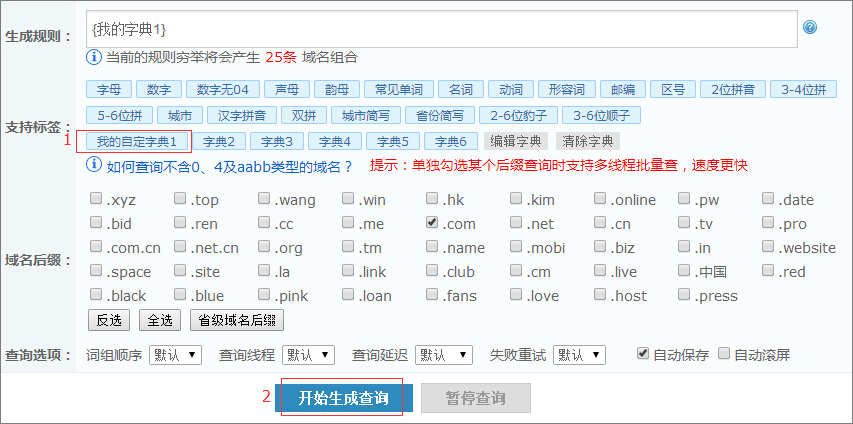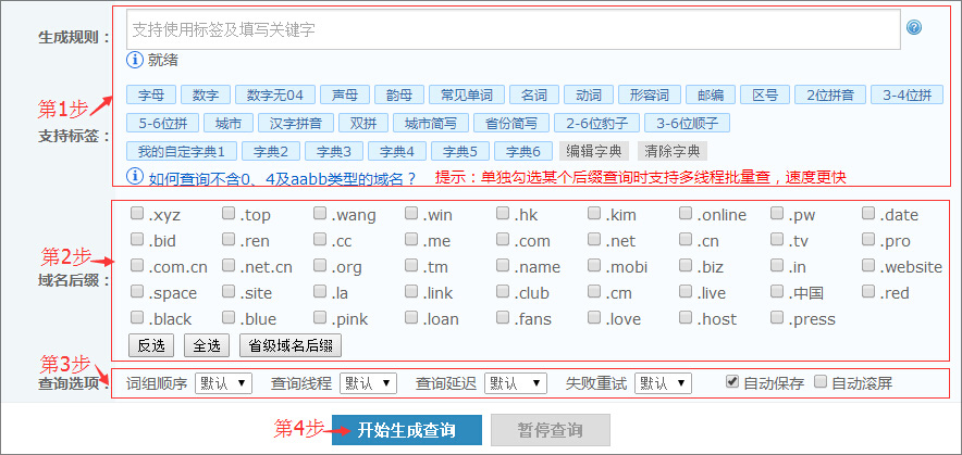 域名批量查询功能常用查询方法教程最近很多玉米都在抱怨,要找到好域名怎么就那么不容易呢,能不能让我批量查下不含0的数字啊,能不能查下不含4的数字啊,能不能查下AABBB这样的域名啊…… 别着急,店小二这就给您支招啦:通过西部数码强大的批量查询功能,您想要的米,统统都能查到。接下来就回答下大家长遇到的问题,以及大家平时想实现的功能来举几个例子: 域名批量查询工具网址:https://www.west.cn/web/mi/ 一、批量查询操作流程和功能介绍 问题1:如何开始批量查询? 回答:如图,第一步,选择你要查询的标签或自己输入相关的关键字;第二步,选择你要查询的域名后缀;第三步,选择相应的查询选项,希望能查询快一点的,可以在查询线程中选择多个线程,不选则使用默认;第四步,点击“开始生成查询”。
