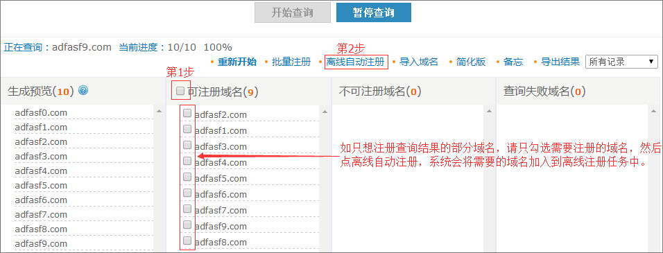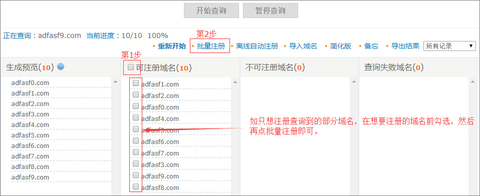 问题3:查询结束后,如何批量注册? 回答:如图,勾选“可注册域名”,点击“批量注册”即可将所选域名加入购物车结算,如果只想注册部分域名,就在想要注册的域名前勾选即可。