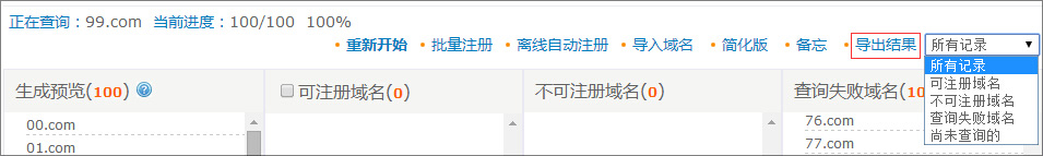 问题6:如何导出域名列表? 回答:如图,在导出结果后下拉菜单中选择要导出列表,然后点击导出结果,即可以txt格式导出想要的文档,方便查询量较大的用户查询后筛选想要注册域名。(格式为每行一个域名)。