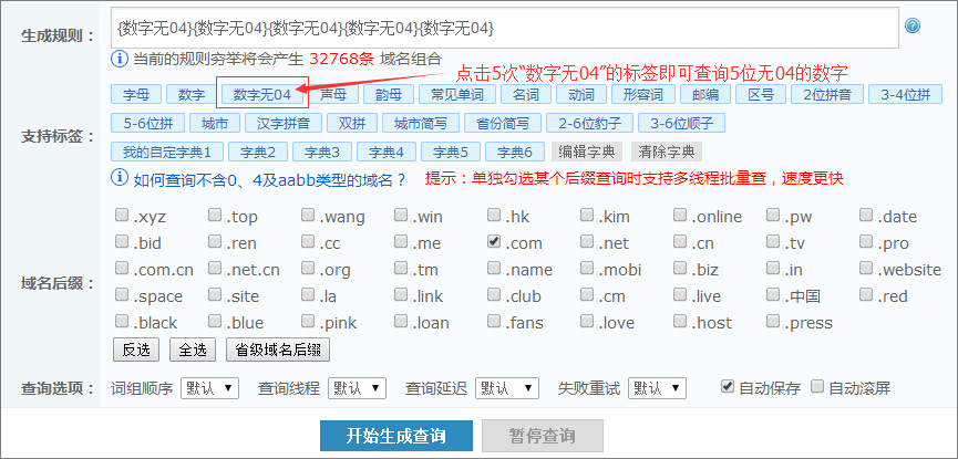 二、常用的特殊查询规则教程 举例1:查询5数字,不含0、4的域名 回答:如图,在查询标签中,点击5次“数字无04”标签。→选择要查询的域名后缀→点击“开始生成查询”。