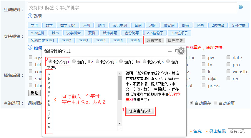 同样的道理,查询2数字、3数字、4数字、6数字、7数字等不含0 4的域名结构,点击相应的标签及次数即可。 举例2:查询不含某一个或多个的字母组合,如不含o的字母组合 回答:如图,点击“编辑字典”,在打开的对话框中,选择“我的字典1”,不输入o这个字母,点击“保存当前字典”