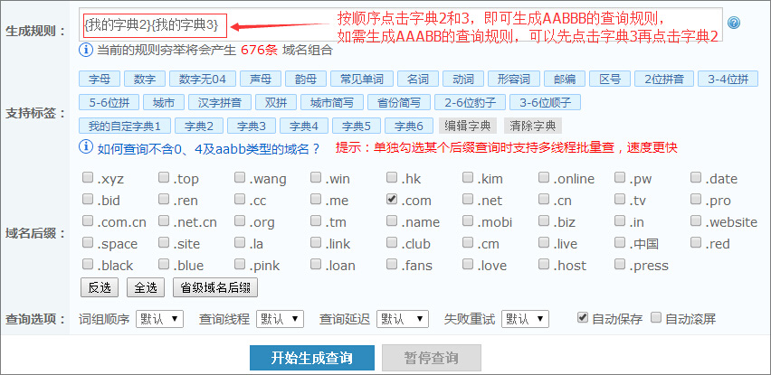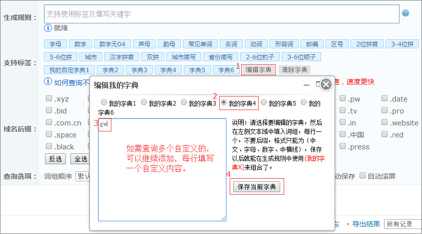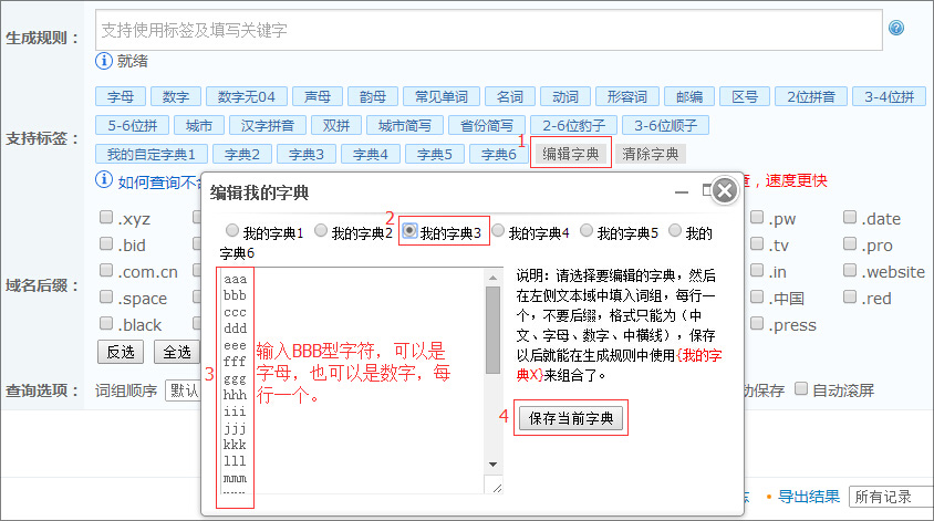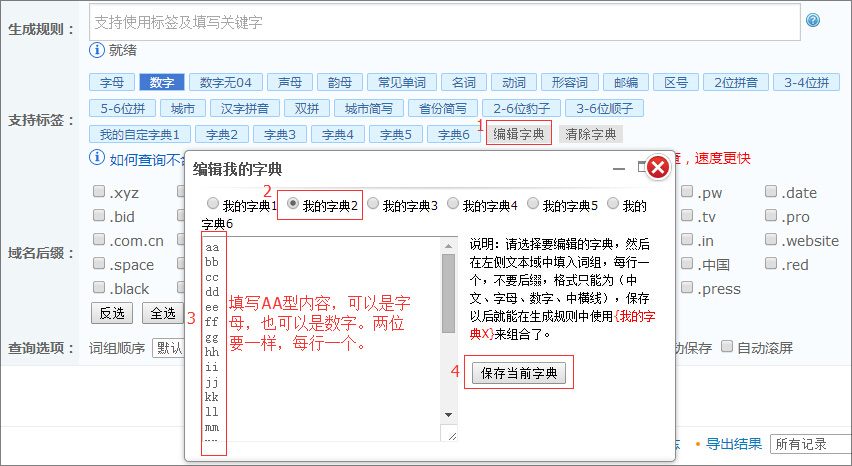 举例3:查询AABBB型的字母的域名 回答:如图,点击“编辑字典”,在“我的字典2”中输入aa、bb、cc、dd……等26个字母,然后点击“保存当前字典”。