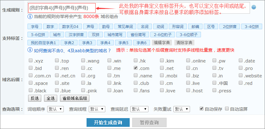自定义标签可以在开头,也可以在中间,也可以在最后,根据您的需求可以指定在想要的位置。除了自定义标签与字母的组合,当然也可以是自定义标签与数字的组合,比如“{我的字典4}{数字}{数字}{数字}”这样的标签,等等。 如果使用过程中遇到任何不明白的地方,请您向我们的在线客服人员进行反馈(企业QQ:800019263),如果您有其他更为复杂的查询需求,或对批量查询操作不熟悉抑或是对查询功能有其他更好的建议,可以联系我司在线客服人员或提交工单给我们。 域名批量查询工具网址:https://www.west.cn/web/mi/
