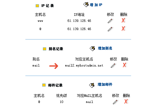 | 9.在我司同时申请域名、虚拟主机、企业邮局,我司的系统会自动解析,解析完毕后应该是下面的设置。当然您也可以自己设置。 | ||