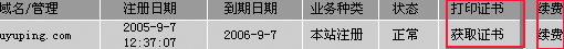 ![]() 点击获取证书即可获取证书。 点击“续费”按钮对名续费。 |