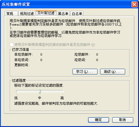 刚开始使用Foxmail5.0的时候,并不使用贝叶斯过滤法对邮件进行判断。使用贝叶斯过滤法,需要首先让Foxmail学习一批垃圾邮件和非垃圾邮件。