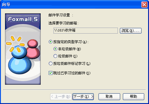 2、单击【学习】按钮,将弹出学习邮件向导,如图五所示。如果在Foxmail主窗口已经选择了要学习的邮箱,那么,所选邮箱将显示在【选择要学习的邮箱】一栏中,否则,请单击【浏览】按钮,在弹出的选择邮箱对话框中,选择准备学习的邮箱。