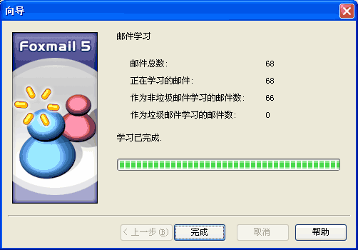 学习完成后,Foxmail将把从邮件中收集到的词语信息保存到词库中,单击【完成】按钮完成对本邮箱的学习。