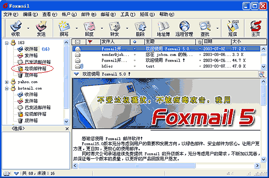 令人佩服的是,使用了一段时间,Foxmail还没有出现过把朋友或者同事发来的邮件当成垃圾邮件的情况,而大多数的垃圾邮件都被自动收到了垃圾箱中,大大减少了处理垃圾邮件而浪费的时间。