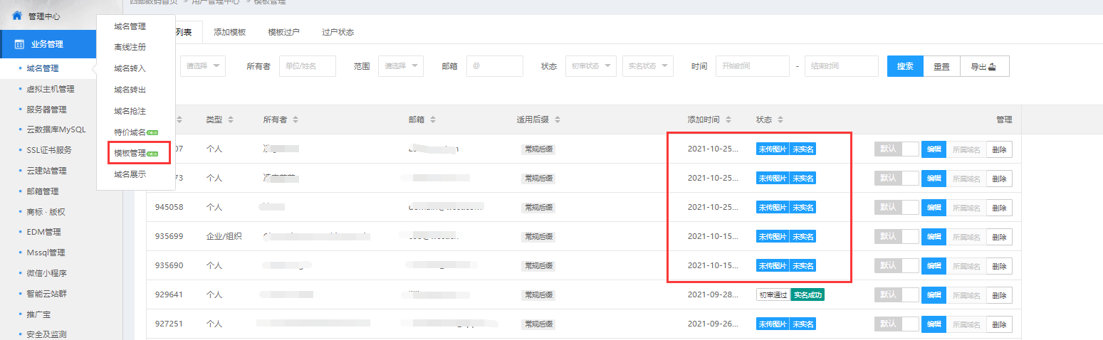 第二步、查看账户下可用模板情况 在模板管理查看是否有模板可用于待实名的域名。(注意:在要求实名前创建的模板已不可用,需重新创建;因页面有缓存,审核状态不一定正确,点击“实名资料”查看结果更准确) 若有可直接进行第五步模板过户;若无则需要重新创建模板提交资料进行审核,不用着急删除所有者信息可用的模板,可用于填充新建模板的信息。