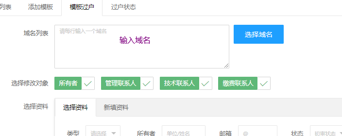 若域名所有者不完全相同,建议将待实名的域名导出筛选后,在模板过户页面填写所有者相同的域名进行过户。