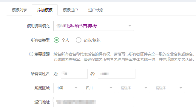 实名认证开始时间请参考:《关于域名实名认证》 第三步、创建模板 在添加模板中填写相关信息: 1、模板填充:若账号下有所有者信息可用的模板,可直接使用模板填充功能。