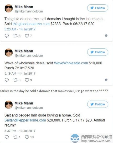 4天获利500倍!论域名玩得溜,我只服Mike Mann西部数码(west.cn)7月14日消息,说真的,小编每次报道Mike Mann的交易消息时,内心都有止不住的羡慕嫉妒恨。尤其是今天这几个域名的交易,小编真的有一种“老大爷倒了都不扶”(不要当真),就服Mike Mann。