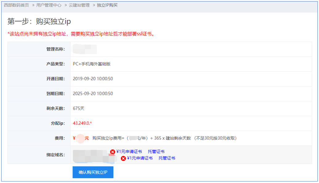 2、根据提示购买独立IP(针对海外机房,国内机房不需要购买,可以直接部署)。