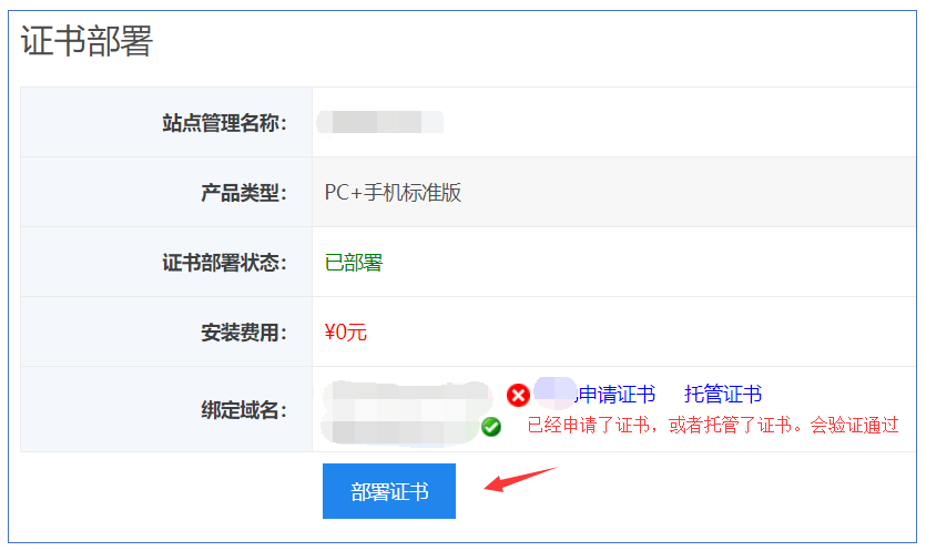 已经申请过证书会,或者托管了第三方申请的证书,会通过验证,直接部署。部署以后请按照要求,将站点域名解析到对应的解析地址,生效后用https://访问看下效果吧。