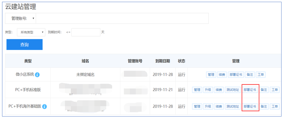 云建站部署SSL证书(https)云建站部署教程如下: 第一步:申请证书,申请地址。 证书申请流程.(注意:云建站申请SSL证书时候,需要使用DNS方式验证) 第二步:部署。 1、登陆管理中心,云建站管理,点击对应站点后的“部署证书”按钮。