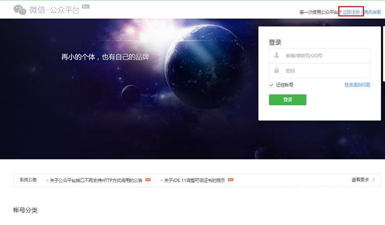 在微信公众平台官网首页(mp.weixin.qq.com)点击右上角的“立即注册”按钮