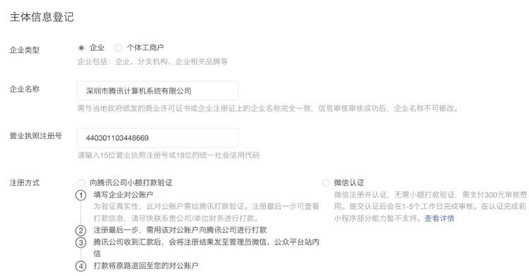 企业类型帐号可选择两种主体验证方式。 方式一:需要用公司的对公账户向腾讯公司打款来验证主体身份。打款信息在提交主体信息后可以查看到。 方式二:通过微信认证验证主体身份,需支付300元认证费。认证通过前,小程序部分功能暂无法使用。