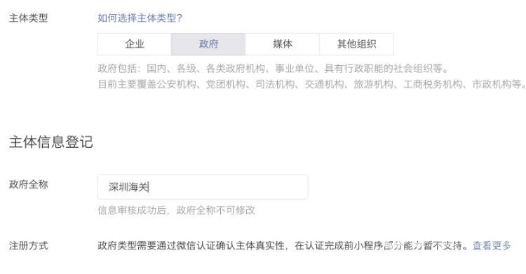政府、媒体、其他组织类型帐号,必须通过微信认证验证主体身份。认证通过前,小程序部分功能暂无法使用。