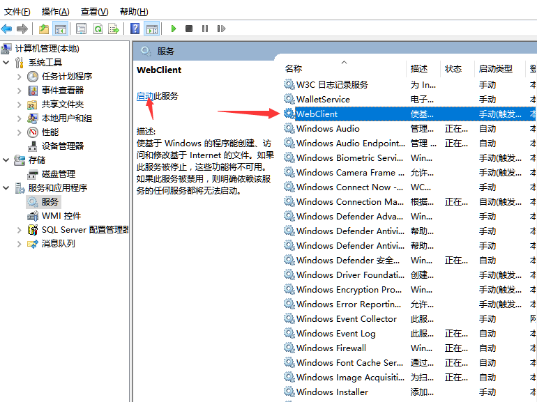 b)找到webclient服务,右键点击webclient服务,启动服务,或者选中webclient服务点击左边启动服务