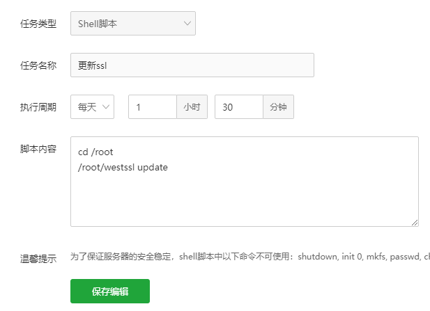 3.您可以通过计划任务方式,完成自动更新证书 : 更新证书命令 /root/westssl update linux任务计划设置方式 (必须确保服务器时间为正确北京时间,否则更新会超时失败!) 1.宝塔环境通过面板任务计划添加每天定时更新 脚本内容: cd /root /root/westssl update