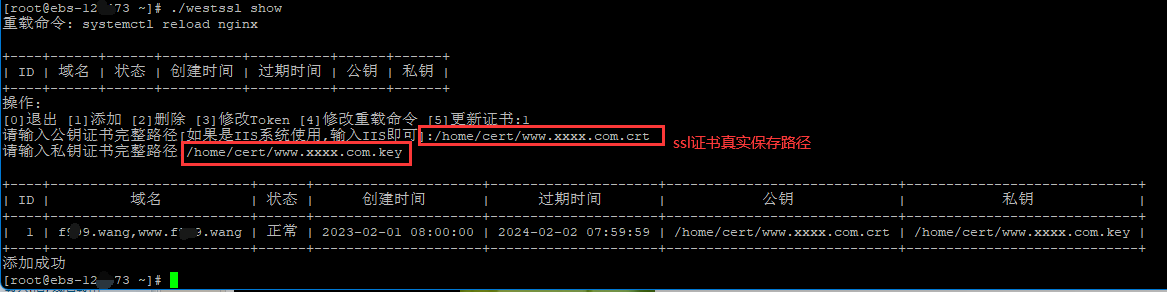 宝塔和西部数码建站助手创建的web环境,系统会识别相关证书,不需要手工添加,可以忽略本步骤。 非宝塔和西部数码建站助手创建的web环境, 需要手动添加ssl证书路径,才能实现自动更新ssl证书。 在show命令下,输入 1 表示添加一个域名证书。