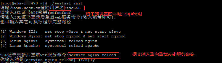 linux(centos)系统下载方法 ssh远程服务器,然后执行 wget http://downinfo.myhostadmin.net/westssl/westssl.zip -O /root/westssl.zip && unzip -o /root/westssl.zip && rm -f /root/westssl.zip && chmod +x /root/westssl 输入 /root/westssl 使用 Windows服务器系统下载方法 ,远程服务器,使用浏览器下载 http://downinfo.myhostadmin.net/westssl/westssl.exe (如下载提示无法安全下载,请右键点击“将链接另存为”。) , 建议保存在 d:\cert 目录。 cmd命令行切换到 d:\cert .输入westssl.exe 使用 westssl版本号:westssl version 1.0.50 1.下载完毕后,首先进行初始化 (重要) 初始化完成会自动生成 .westssl\config.ini,请勿删除 /root/westssl init 重启重载web服务命令可以选择对应编号,也可以自己手动输入,请务必据实输入! 2.查看当前服务器证书列表 /root/westssl show
