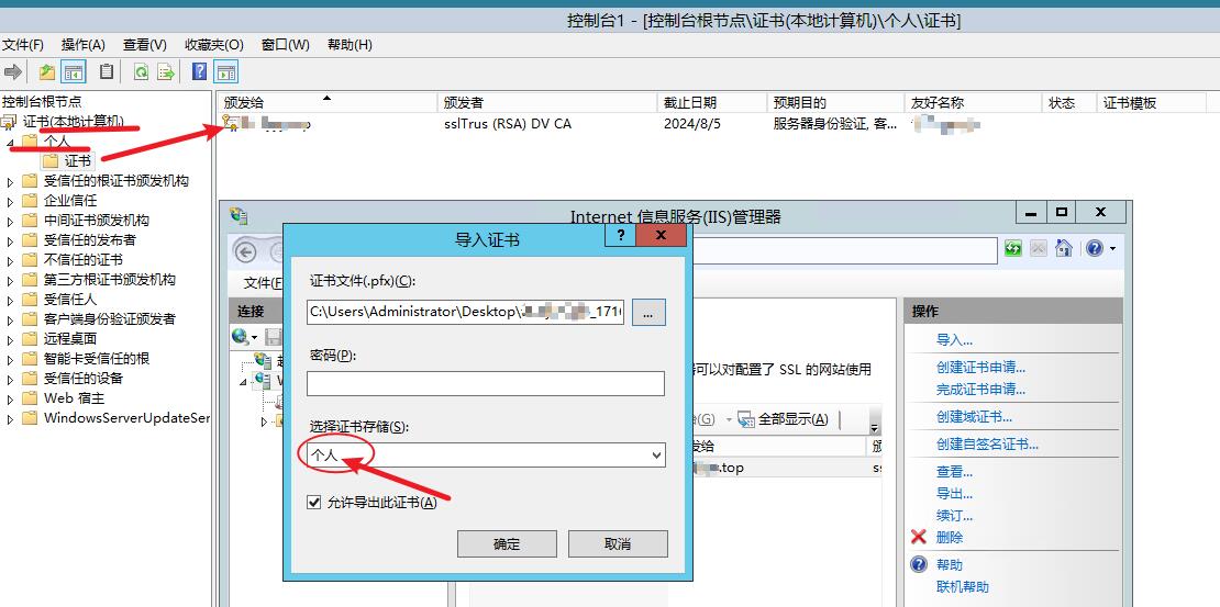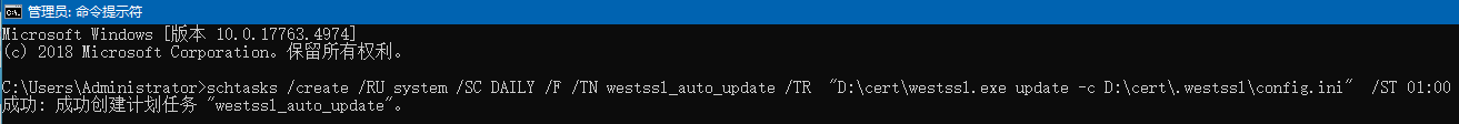 schtasks /create /RU system /SC DAILY /F /TN westssl_auto_update /TR "D:\cert\westssl.exe update -c D:\cert\.westssl\config.ini" /ST 01:00 其中: westssl_auto_update 计划任务名称 "D:\cert\westssl.exe update -c D:\cert\.westssl\config.ini" 要执行的程序及参数 /ST 01:00 每天1:00执行 成功创建计划任务后即可每天1点自动更新ssl证书. 注: api result: token 时间超时:请检查服务器时间是否为北京时间 . 1、 westssl update 在windows系统下会在 .westssl 下级目录生成westcertapp.exe执行文件,此是正常更新文件放心使用。 若此文件执行失败IIS对应站点证书会更新失败,会影响网站正常访问。 2、westssl update 这个命令会自动检测当前服务器上所有证书的到期时间,如果离到期时间小于30天,或过期30天以内的, 会自动调用西部数码SSL证书api接口,来检查相关的域名有没有新的证书颁发成功,如果有,则自动下载新证书进行替换, 替换后会执行相关的命令来重启IIS/apache/ngix以使新证书生效。 3、如果通过IIS手动导入SSL证书时,证书存储必须选择 个人, 否则 westssl无法识别