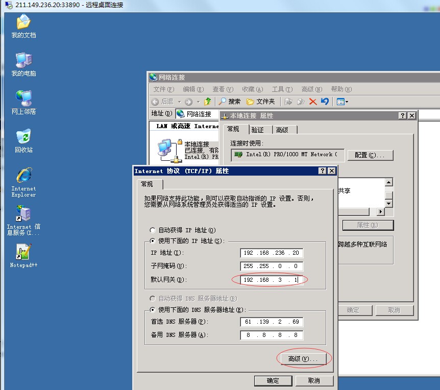即将“默认网关”设置为之前收集到的负载均衡器内网IP,此处假设为“192.168.3.1”