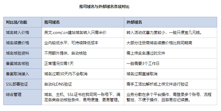 使用“外部入库”功能,在我司管理的外部第三方英文.com/.cn建站域名,续费时选择转至我司接口可享5折低价:.com低至35元,.cn仅需16元。
