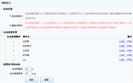 空间卫士是用来对您的邮箱容量快要达到邮箱总空间时的一个报警设置,为了能让您的邮箱能正常工作,您可以设置空间卫士标准设置,系统将根据您的设置维护您的邮箱空间,保证您邮箱的正常工作。当您的邮件总容量到达邮箱空间80%或接近于它,系统有两种标准设置,你可以通过选择上边的选择框看到详细情况。
