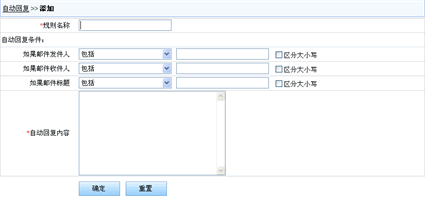 在这个页面里填入自动回复规则名称(名称不能为空)及自动回复的条件以及回复的内容(内容不能为空),系统提供三种条件(邮件发件人、邮件收件人、邮件标题),如果要区分大小写点击后面的“区分大小写”方框,完成后,单击“确定”按钮即可生效。