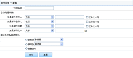 在这个页面里填入自动处理规则名称及填入需要自动处理条件,系统提供四种条件(邮件发件人、邮件收件人、邮件标题、邮件大小),如果要区分大小写点击后面的“区分大小写”方框,三种自动处理方式(复制到、移动到、拒绝接收),填写和选择好自动处理的条件和处理方式后,点击“确定”按钮即可生效。 8.5.2