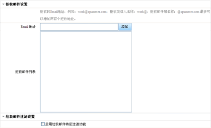 在文本框内输入要拒收的邮件地址,然后单击“添加”按钮,即可将输入的邮件地址添加到拒收列表中。设置生效后,系统将自动拒绝接收拒收列表内邮件,避免您受它们的邮件骚扰。在“拒收列表”里选中一个邮件地址后点击“删除”按钮,即可正常接收该地址的邮件。