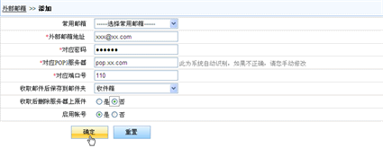 设置从外部邮箱帐号读取邮件。为了能够设置该选项,您必须确认您的外部邮箱帐号可在外部网络访问POP3服务器.。单击左侧菜单中的“外部邮箱”即可打开邮箱代理页面。在“邮箱”页面单击“添加”打开“添加pop3服务帐号”页面后即可添加一条邮箱代理帐号。