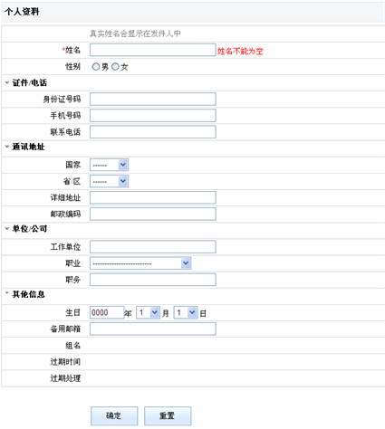 这个页面主要是用户个人基本资料的显示,用户可以对其进行修改或检查(姓名不可以为空)。填写完成后点击“确定”按钮即可。