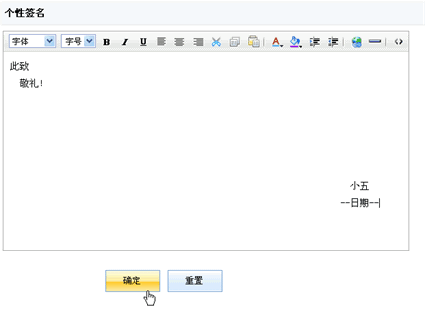 在这个页面里您可以自己设定邮件的签名内容。如果您想使用个性签名,您可以在“写邮件”页面完成撰写邮件后单击“签名”即可。