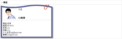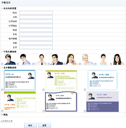 在上图所示页面中“名片内容设置”中输入名片中相应的信息,例如姓名,头衔等,然后选择一个头像,然后在“名片模板选择”部分选择一种名片模板,单击“预览”按钮可以预览生成的的名片样式,如下图所示: