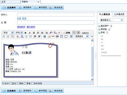 如果您觉得名片您还满意,单击确定按钮即可。如果您要将设置的名片加入到邮件中,您可以进入写邮件页面,选择一种信纸或单击"更改编辑方式"按钮进入多媒体编辑模式,然后勾选“名片”前的复选框即可将设置的名片添加到邮件的内容后。如下图所示: