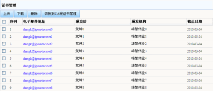在电子邮箱左侧的菜单点击“个人设置/证书管理”,进入电子邮件证书管理界面。管理功能包括收件人个人证书管理以及收件人CA证书管理。在界面中可通过“切换到”按钮在两个管理界面中进行切换。如下图: