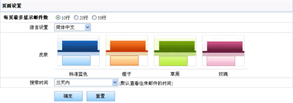 在页面设置中您可以设置每页显示最多显示的邮件数,登录后缺省页面,以及页面的风格、语言以及设置的有效期。在这里您可以对页面自行设置,设置完毕后点击“确定”按钮生效。