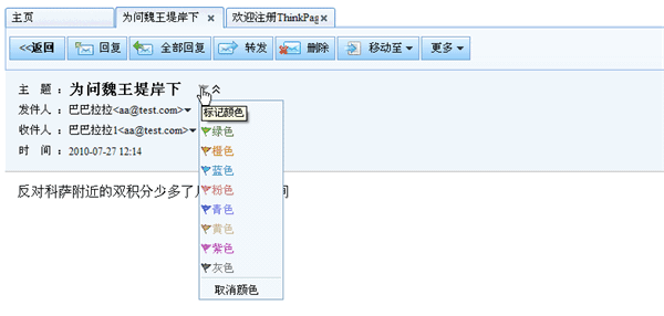 2.9 打印预览 点击【更多】-【打印预览】,进入邮件打印预览页面。 2.10 标记颜色 点击【更多】-【标记颜色】,将此封邮件标记颜色,返回收件箱中,此封邮件的主题也会跟着改变,也可以通过邮件主题后面的快捷下拉来标记颜色。