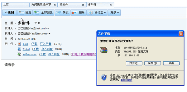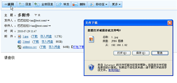 2.15 附件下载 若邮件中有附件,点击附件后的下载可以打开或者将附件保存到本地。