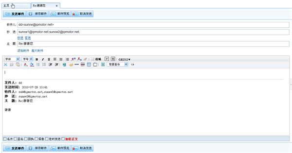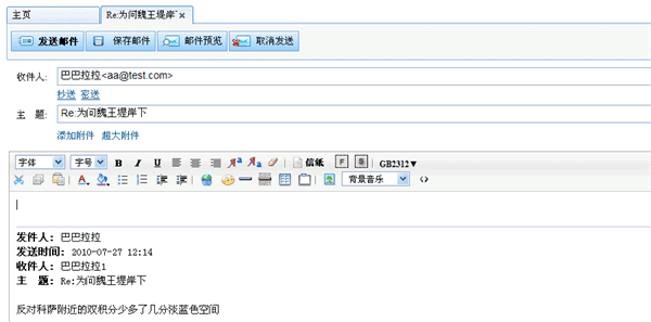 2.2 回复 点击【回复按钮】,进入回复写邮件页面,系统会自动填写收件人、主题、内容等。