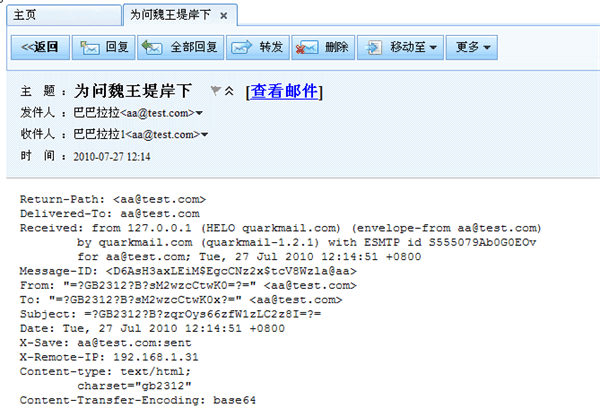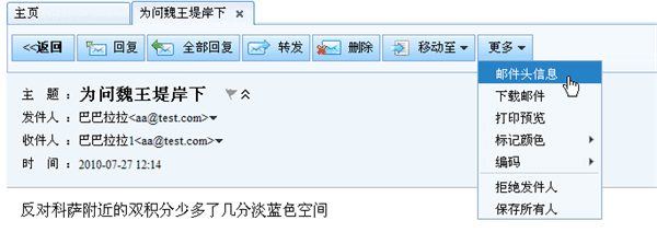 2.7 查看邮件头信息 点击【更多】->【邮件头信息】,进入查看邮件头信息页面,点击主题后面的【查看邮件】链接将返回邮件正常显示模式。