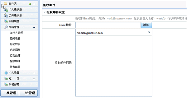 2.11 选择编码 点击【更多】-【编码】,有时候您的邮件会是乱码,选择正确的编码邮件才能正常显示。 2.12 拒绝发件人 点击【更多】-【拒绝发件人】,将此封邮件发件人加入到黑名单中,您可以通过左侧菜单->邮箱管理->拒收列表,维护您的黑名单。如下图所示: